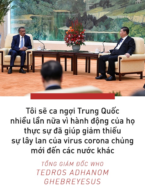 Tổng giám đốc WHO Tedros Adhanom Ghebreyesus liên tục ca ngợi các nhà lãnh đạo Trung Quốc. “Chúng tôi đánh giá cao sự nghiêm túc mà Trung Quốc đang cho thấy trong việc ứng phó với dịch bệnh, đặc biệt là cam kết từ lãnh đạo cao nhất", ông Tedros nói trong cuộc gặp với Chủ tịch Trung Quốc Tập Cận Bình.
