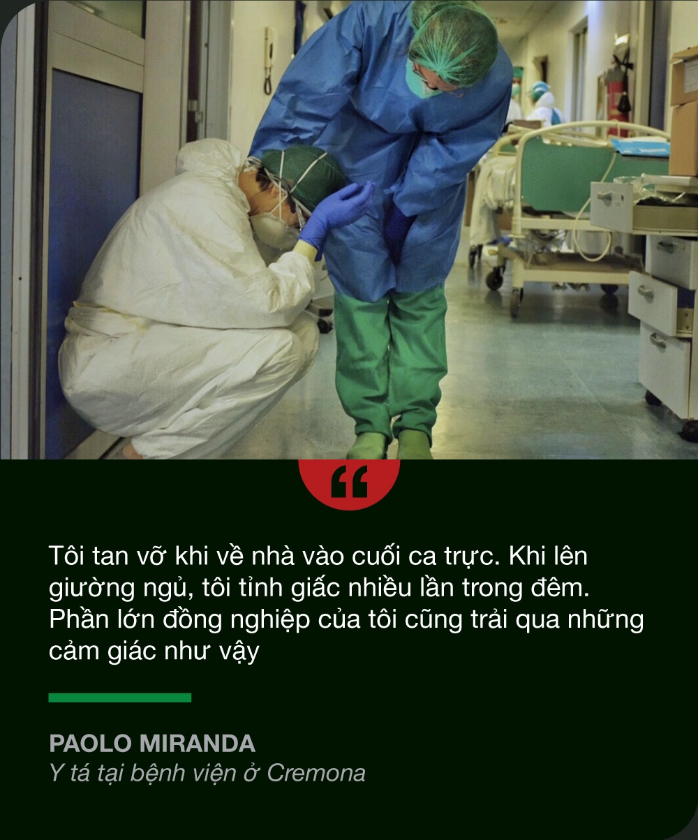 Anna, nhân viên y tế 24 tuổi tại một bệnh viện khác ở Lombardy, nói rằng phải ở xa những người thương yêu nhất vào phút cuối là “điều khó khăn nhất”, không có ai ở bên “để nắm lấy bàn tay hay thì thầm đôi điều bên tai”.