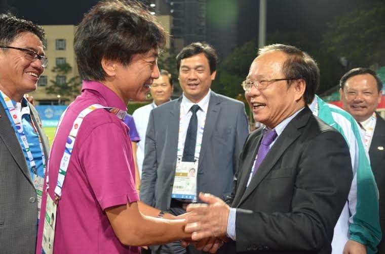 | Bộ trưởng Hoàng Tuấn Anh xuống sân chúc mừng ban huấn luyện và các cầu thủ ngay sau khi kết thúc trận đấu U23 Việt Nam - U23 Lào. Ảnh: Thanh Liêm. |
