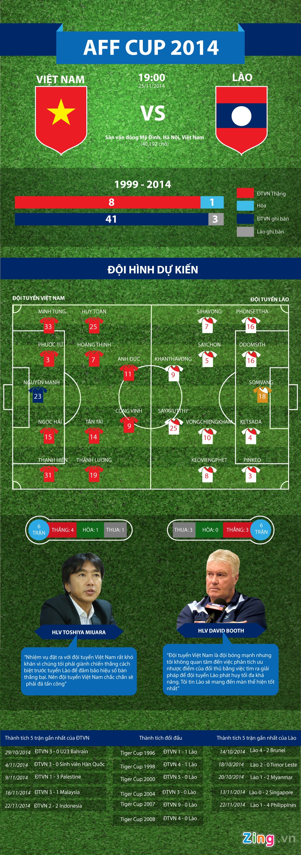 Sau trận hòa 1-1 ở Tiger Cup 1996, tuyển Việt Nam đã có 5 trận thắng liên tiếp trước ĐT Lào. Tối nay, thầy trò HLV Miura mong sẽ thắng đậm để chiếm lợi thế giành vé vào bán kết.
