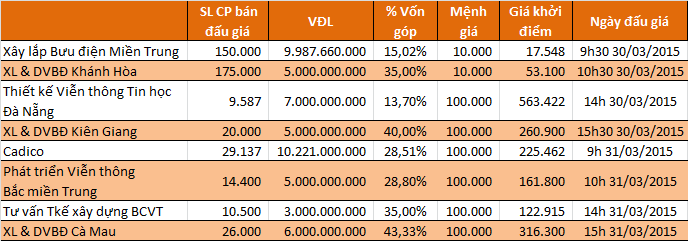 Thời gian đăng ký và nộp tiền đặt cọc đấu giá CTCP Xây lắp Bưu điện Miền Trung và Thiết kế Viễn thông Tin học Đà Nẵng từ ngày 27/2 đến 26/3/2015. Các phiên đấu giá khác sẽ có thời gian đăng ký và nộp cọc từ 2/3 đến 26/3/2015.