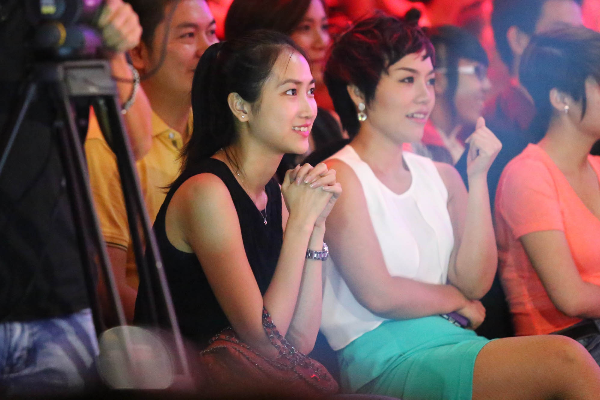 | Cô chăm chú theo dõi chương trình, đặc biệt là thể hiện của ông xã trên ghế nóng. |