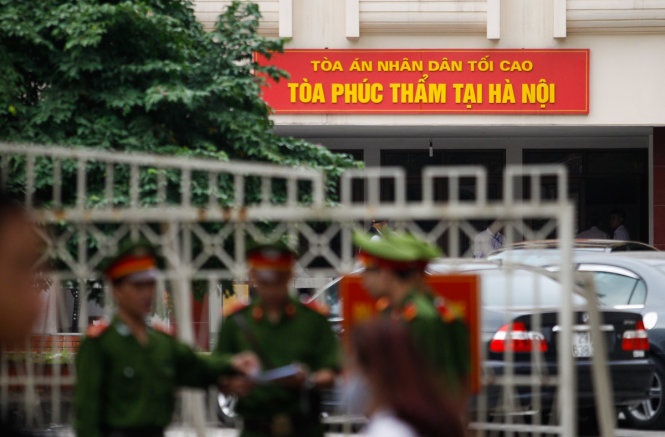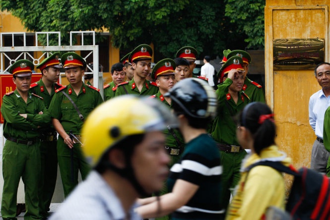 Lực lượng an ninh được phong tỏa dày đặc tại tòa phúc thẩm. Suốt tuyến đường Đội Cấn, đường vào trụ sở tòa án, lực lượng công an, bảo vệ đã được bố trí nghiêm ngặt từ sớm. Ảnh: Tuổi trẻ.