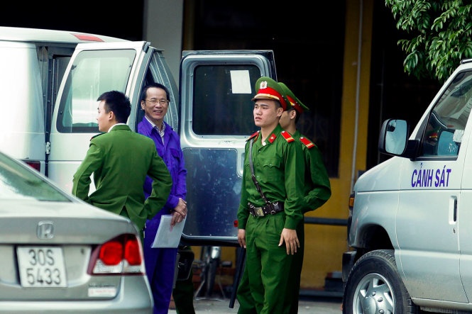 Khoảng 7h, Nguyễn Đức Kiên cùng 5 bị cáo bị xét xử trong vụ án được dẫn giải đến tòa. Ngoài Nguyễn Đức Kiên kháng cáo kêu oan toàn bộ bản án sơ thẩm, 5 bị cáo thuộc nhóm tội Cố ý làm trái quy định của Nhà nước - nguyên là lãnh đạo của Ngân hàng TMCP Á Châu (ACB) cho rằng mình không phạm tội. Trong ảnh: Bị cáo Lý Xuân Hải - nguyên tổng giám đốc ngân hàng ACB tươi cười khi xuất hiện. Ảnh:Tuổi trẻ.