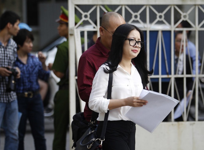 Hơn 8h, bà Đặng Ngọc Lan (vợ của bầu Kiên) vận sơ mi trắng, quần âu đen làm thủ tục, di chuyển vào sân tòa. Ảnh: Tuổi trẻ.