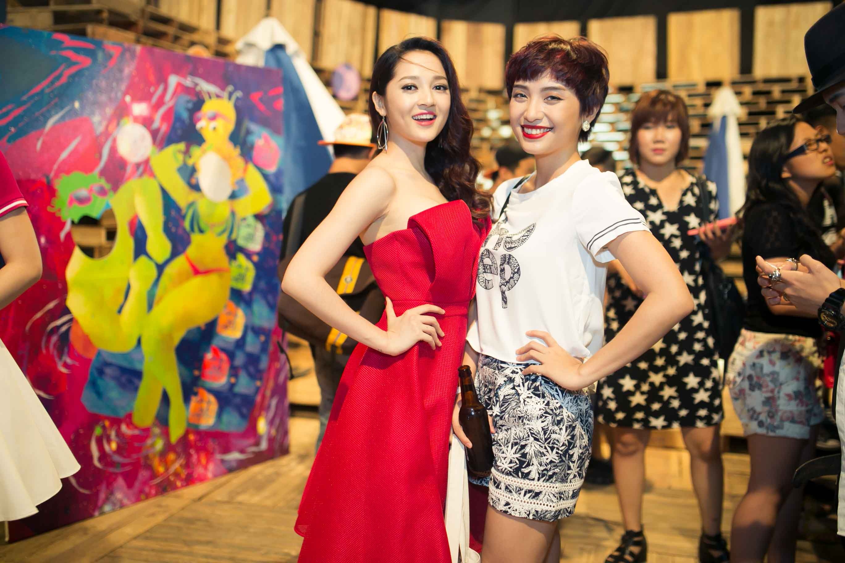 | Bộ đôi bạn thân Hoàng Yến Chibi và Hòa Minzy - hai thí sinh thành danh sau cuộc thi Học viên ngôi sao - thân thiết bên nhau suốt bữa tiệc. Trong khi Hoàng Yến điệu đà với váy hoa đa sắc màu, Hòa "liều" lại trẻ trung và năng động với jumsuit và blazer ton-sur-ton. |