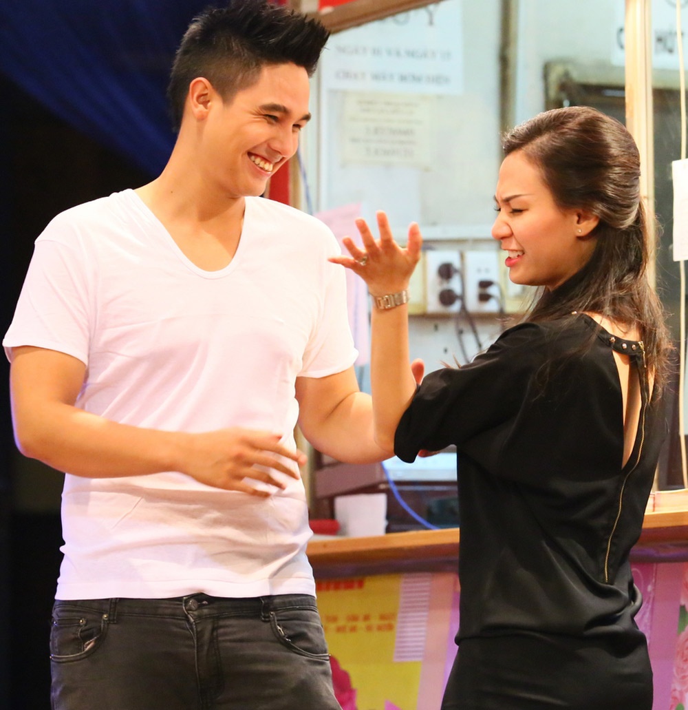 Quỳnh Trâm cười "tít mắt" khi xem chồng diễn kịch. Cô từng chia sẻ, khi quyết định tiến đến hôn nhân với Baggio, gia đình cô đều ngăn cản. Nữ nha sĩ xinh đẹp cho biết: "Baggio là người hội tụ tất cả những điều mà mẹ không thích. Khi quyết định cưới, tôi gọi điện thoại qua để nói với gia đình trước, mẹ rất sốc vì không nghĩ sớm và nhanh vậy, lại còn là người nhỏ hơn 3 tuổi và làm trong ngành showbiz".