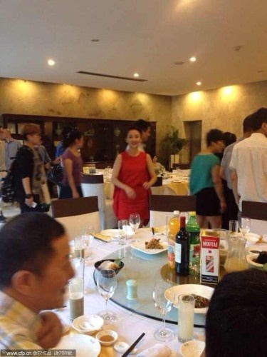 Tuy nhiên, bữa tiệc này cũng đơn giản như đám cưới, chỉ có khoảng 8 bàn tiệc với sự tham gia của người thân và không có người bạn, đồng nghiệp nổi tiếng nào. Vợ chồng Châu Tấn cũng ăn vận giản dị với trang phục đời thường. Cô dâu diện một chiếc váy suông đỏ. Còn chú rể là quần âu với áo sơ mi bỏ ngoài.