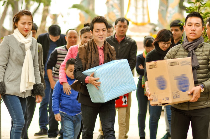 | Vợ chồng Đăng Khôi cùng bạn bè chuẩn bị rất nhiều quần áo ấm, thực phẩm và nhu yếu phẩm cần thiết để gửi tặng các em nhỏ đang sống trong chùa. Là những ông bố bà mẹ, đôi vợ chồng trẻ hiểu rõ những khó khăn trong chuyện nuôi dưỡng, chăm sóc các em nhỏ hàng của bảo mẫu. |