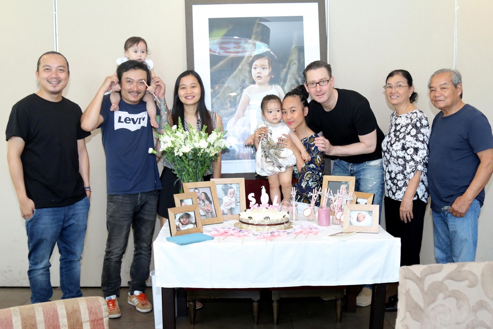| Vợ chồng Đoan Trang và con gái hạnh phúc chụp hình bên ba mẹ và 2 em trai. Nữ ca sĩ và ông xã người Thụy Điển 2 lần tổ chức sinh nhật 1 tuổi cho công chúa nhỏ. |