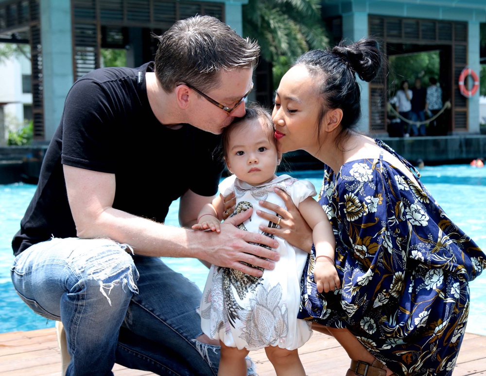 | Bé đang ở giai đoạn chập chững tập đi nên vợ chồng nữ ca sĩ dành nhiều thời gian bên con gái. |