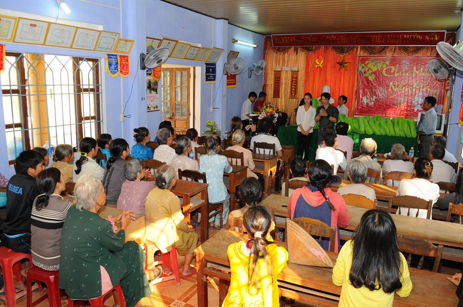 | Sau buổi trao quà tặng, vợ chồng diễn viên phim Trúng số còn giao lưu, trò chuyện cùng ban lãnh đạo xã Vinh Hải. |