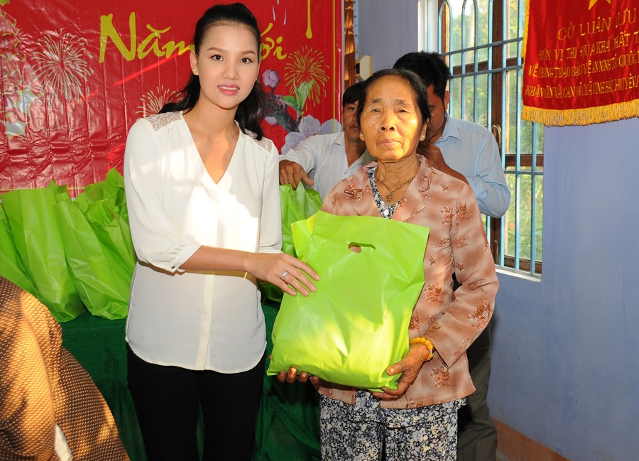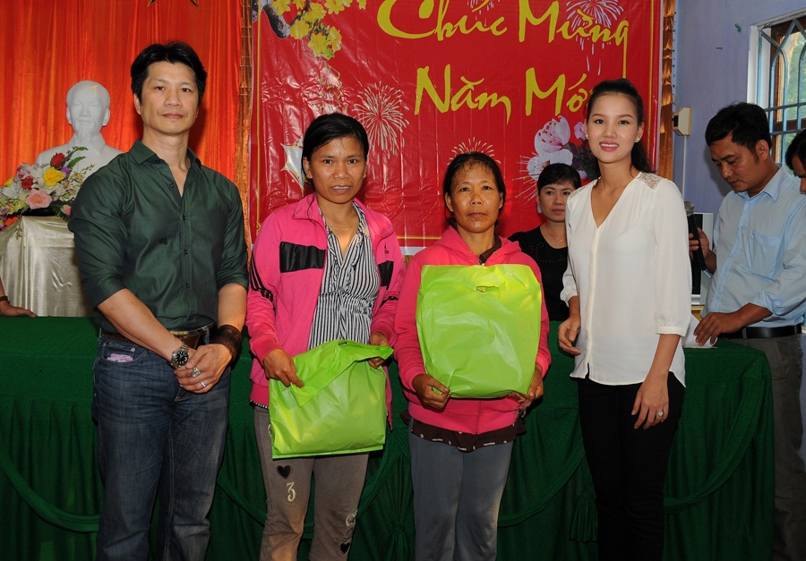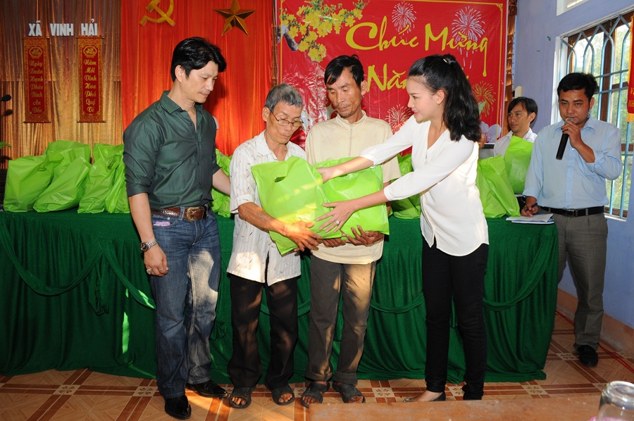 | BeBe Phạm nhiệt tình trao những phần quà cho từng hộ nghèo. |
