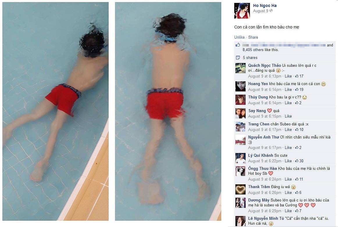 Ngày 10/8, Hà Hồ đăng tải lên trang cá nhân hình ảnh cậu con trai cưng Subeo tập lặn trong hồ bơi, kèm theo lời chú thích đầy tình cảm: "Con cá lặn tìm kho báu cho mẹ".