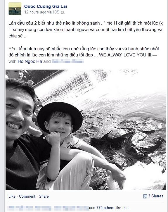 Cũng trong ngày hôm 10/8, ông xã của Hồ Ngọc Hà là thiếu gia Quốc Cường còn chia sẻ hình ảnh dẫn con trai đi phóng sinh ngày rằm tháng bảy. Anh viết khi đăng tải ảnh mới: "Tấm hình này sẽ nhắc con nhớ rằng, lúc con thấy vui và hạnh phúc nhất chính là lúc con làm những điều tốt đẹp".