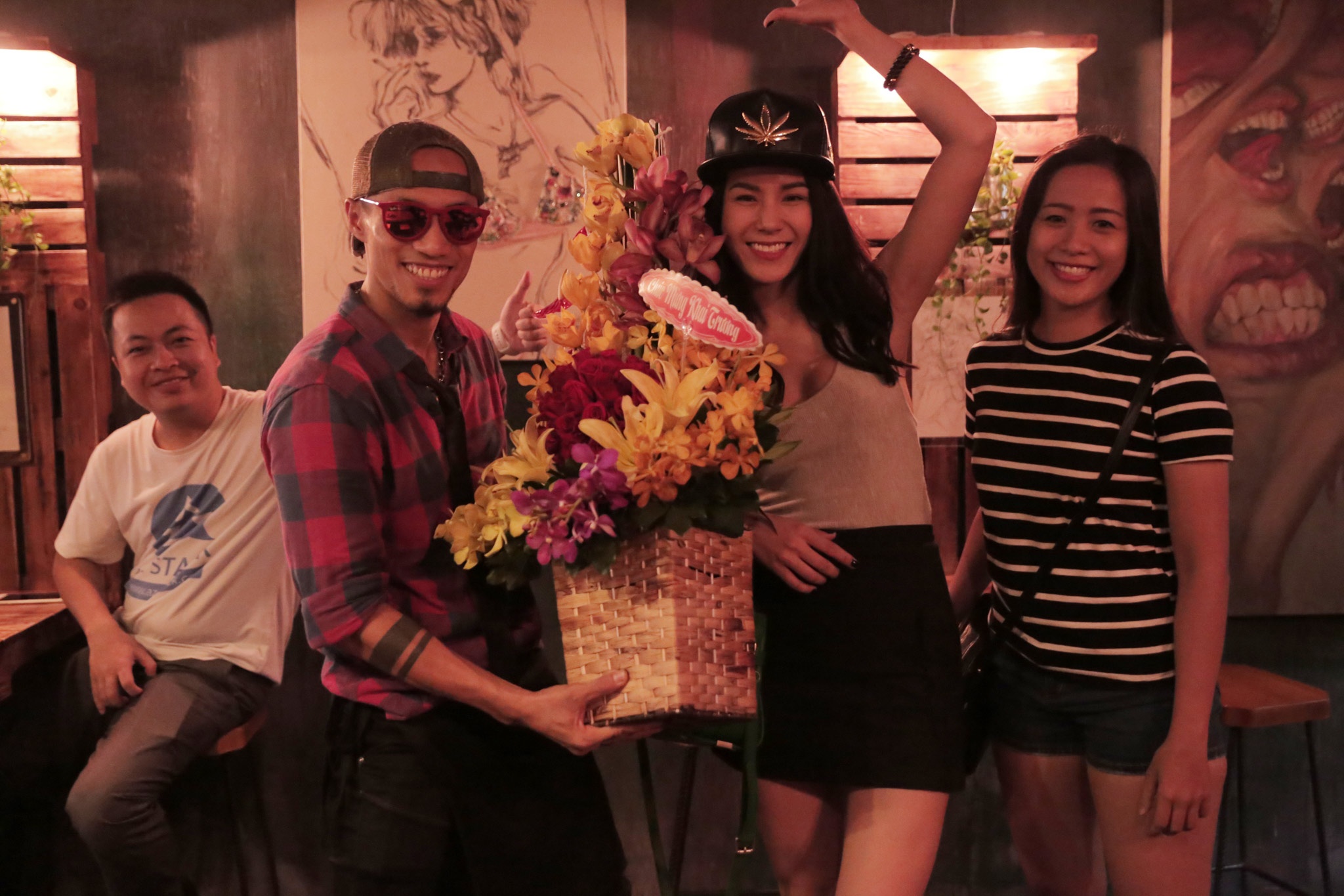 Diệp Lâm Anh và Phạm Anh Khoa từng đóng chung bộ phim Siêu nhân X. Cô mang lẵng hoa tươi đến chúc mừng nam ca sĩ lên chức ông chủ. |