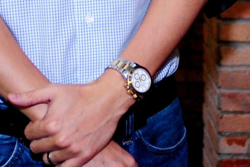 Đôi vợ chồng trẻ mặc giản dị nhưng điểm nhấn là cùng đeo đồng hồ đôi đắt giá trong tiệc khai trương nhà hàng hải sản của họ tại quận 3, TP.HCM tối 19/2.