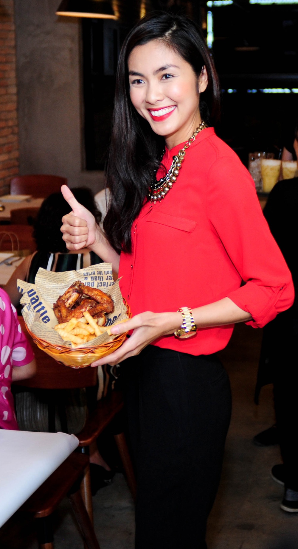 Nữ diễn viên xinh đẹp giới thiệu những món ăn của nhà hàng. Thời gian qua, cô khá tất bận chuẩn bị khai trương nên nhiều người nhận xét người đẹp gầy đi trông thấy.