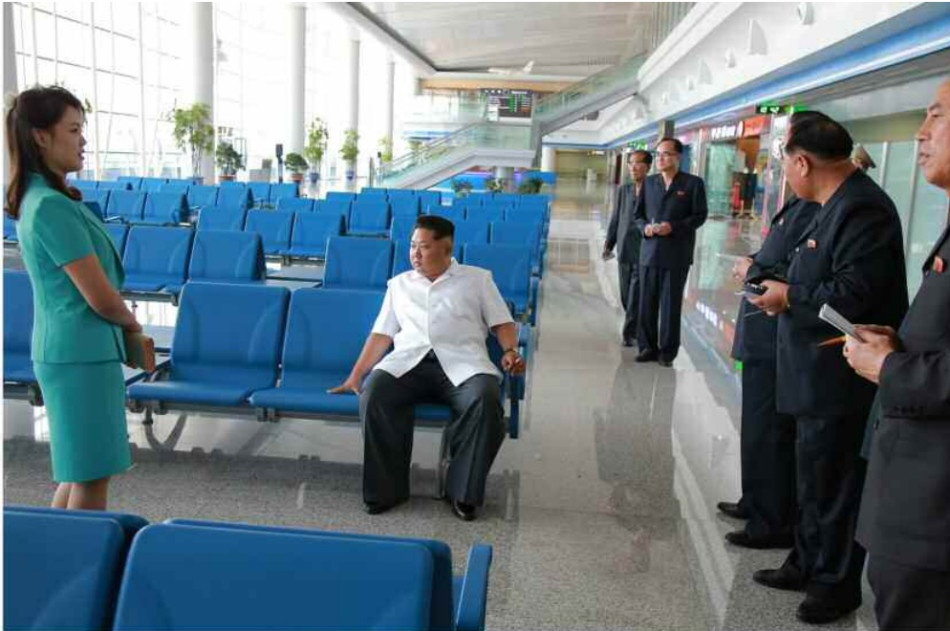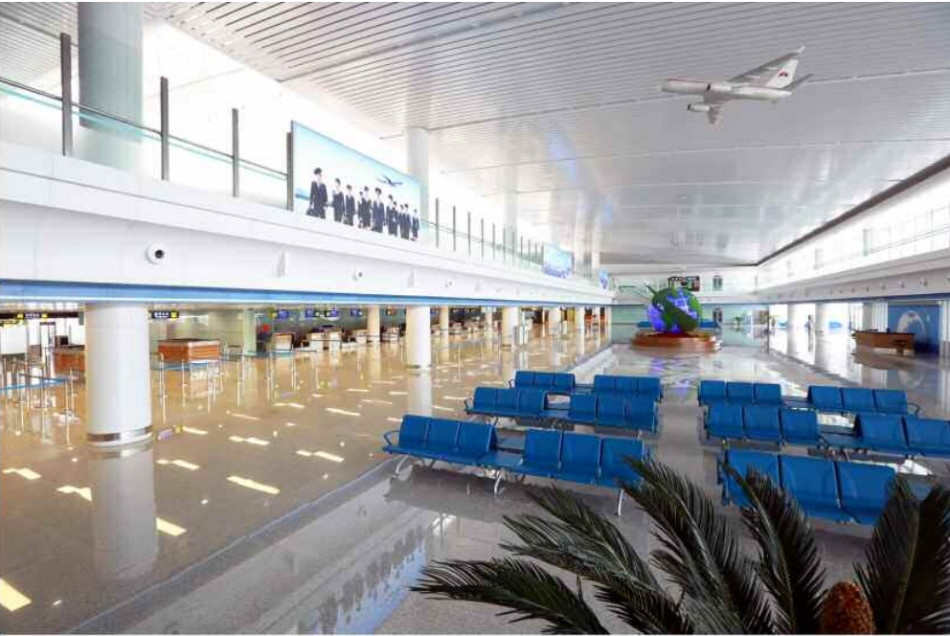 Bên ngoài cảng hàng không mới của Triều Tiên. Trước đó, cuối năm 2014, ông Kim đã hạ lệnh tạm dừng thi công nhà ga số 2 sân bay quốc tế Bình Nhưỡng để chờ bản thiết kế mới do cách bố trí nội thất vẫn còn lệch lạc và buồn tẻ. Nhà lãnh đạo 32 tuổi cũng chỉ thị cho các quan chức xây dựng một tuyến đường sắt cao tốc và một tuyến đường bộ để đảm bảo giao thông thông suốt từ sân bay tới khu vực trung tâm của thủ đô Bình Nhưỡng.