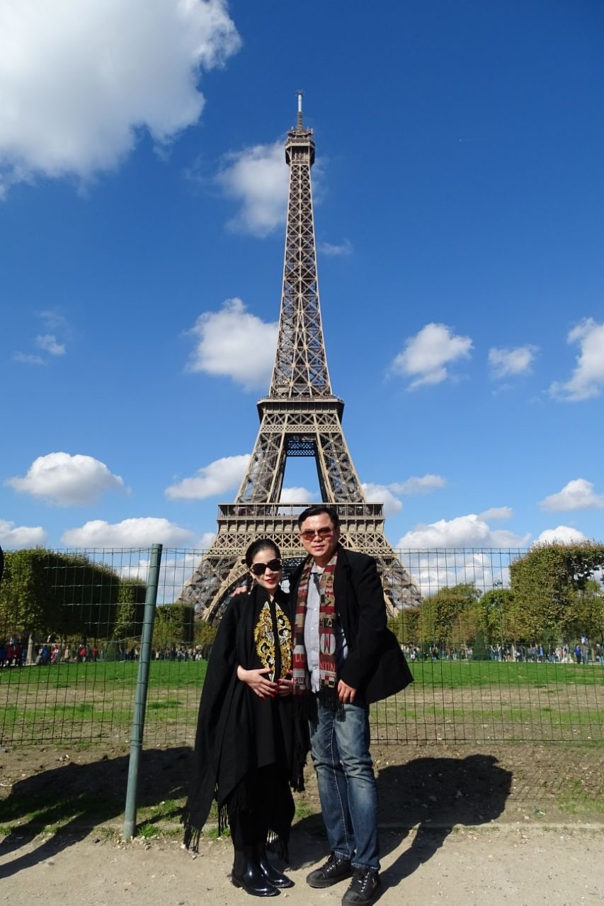 | Vợ chồng Lan Hương chụp kỉ niệm bên tháp Eiffel. |