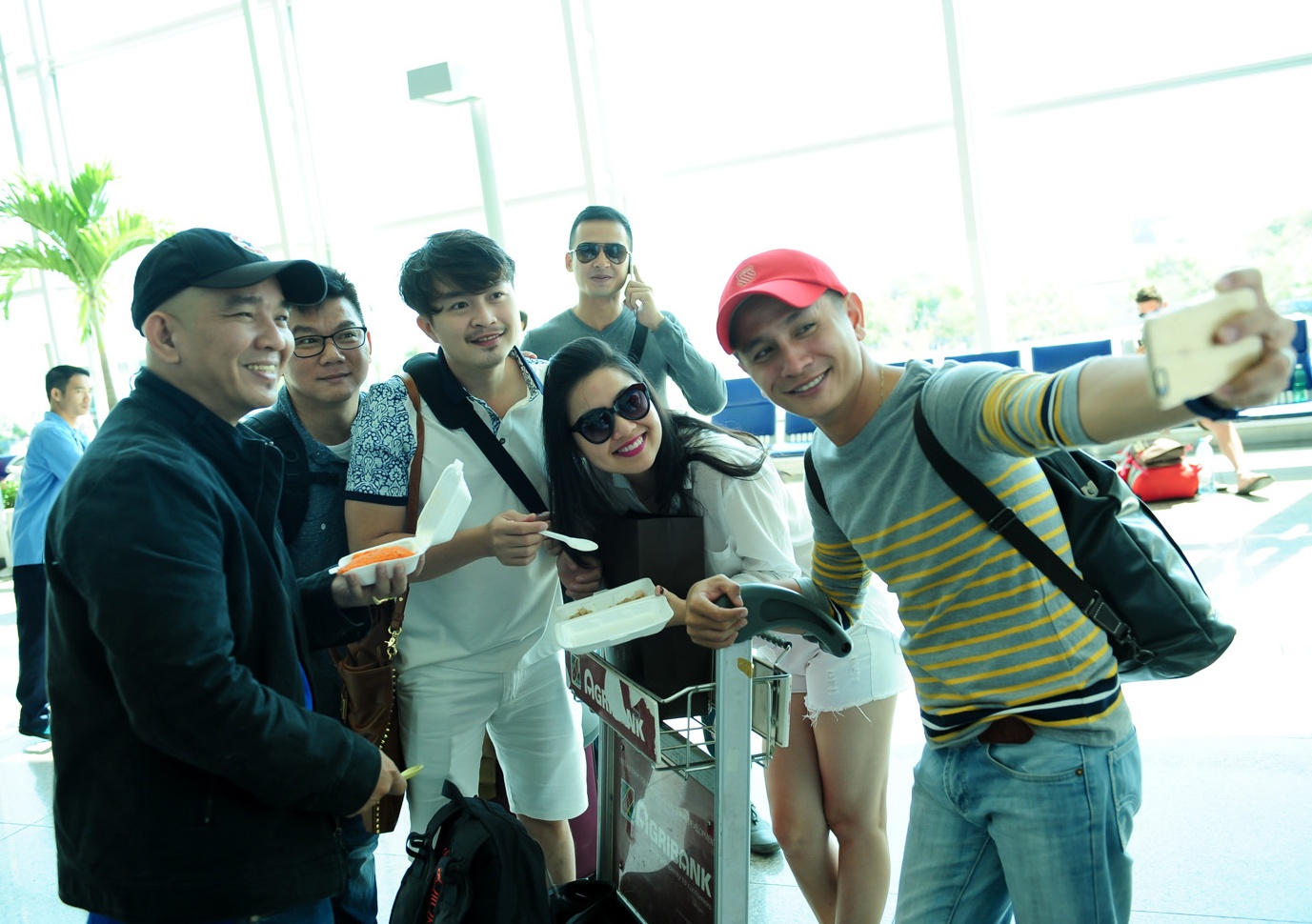 | Các thành viên trong đoàn tranh thủ chụp ảnh "selfie" trước khi lên máy bay. |