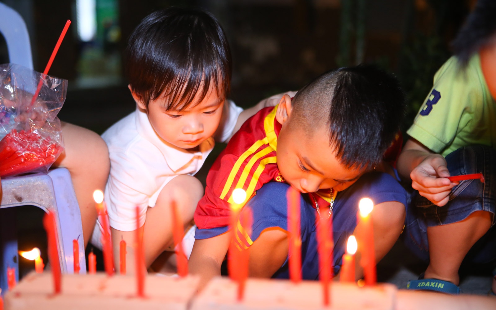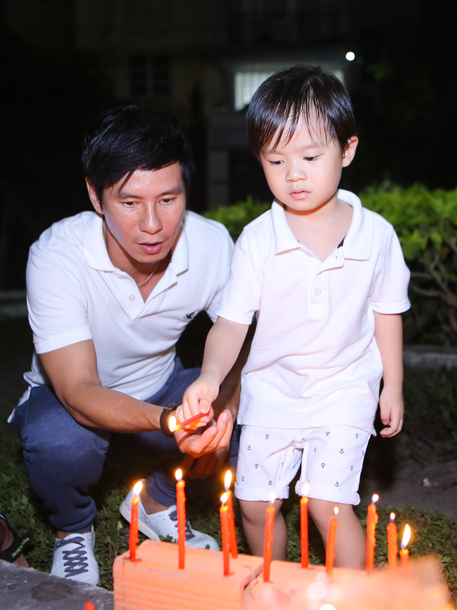 | Trong khi các em chịu sự quản lý của mẹ, anh cả Rio hào hứng tham gia trò đốt nến. Bố Lý Hải hỗ trợ con trai vì sợ con không may bị phỏng. |