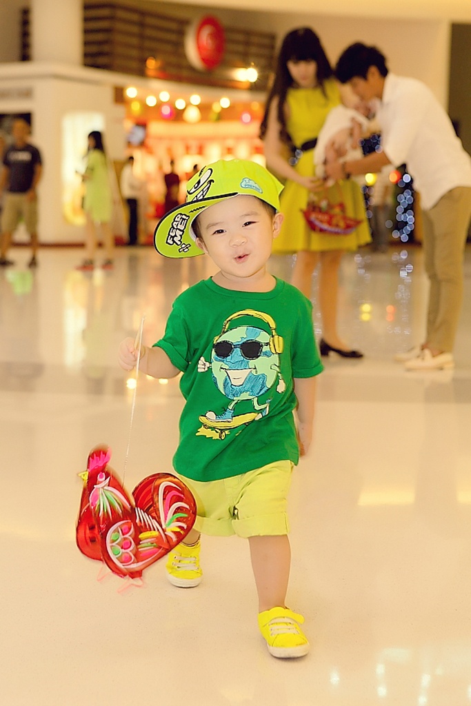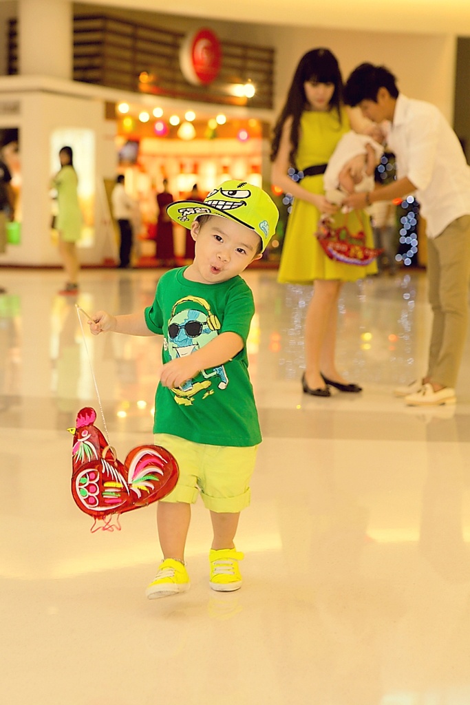 | Hình ảnh đáng yêu của bé Rio khi cầm chiếc lồng đèn có hình chú gà trống trên tay. |