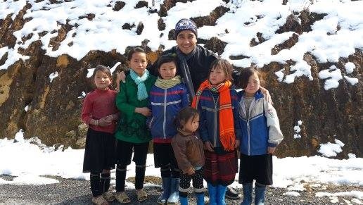 | Quyền Linh bên các em nhỏ ở vùng cao trong ngày nắng lên và tuyết đang tan dần. |