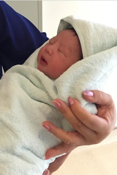 | Tuấn Tú hạnh phúc bế con trai đầu lòng. Ảnh: FBNV |