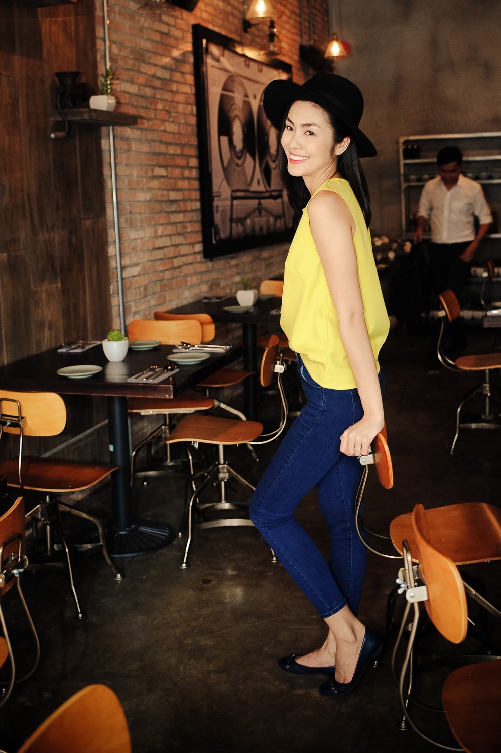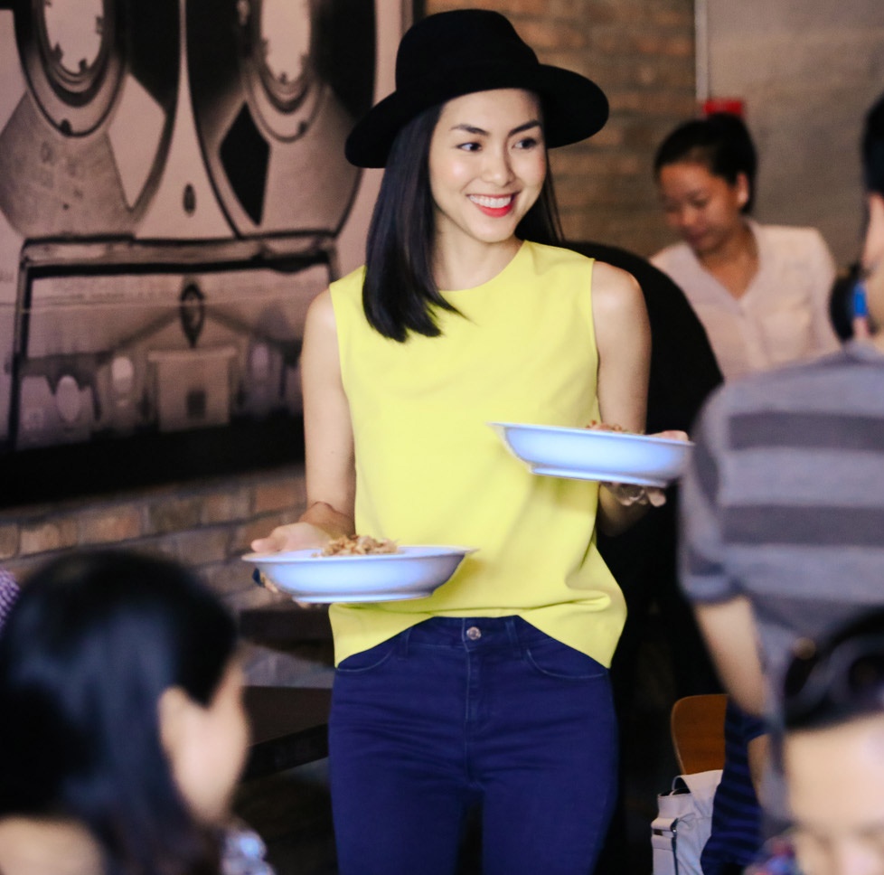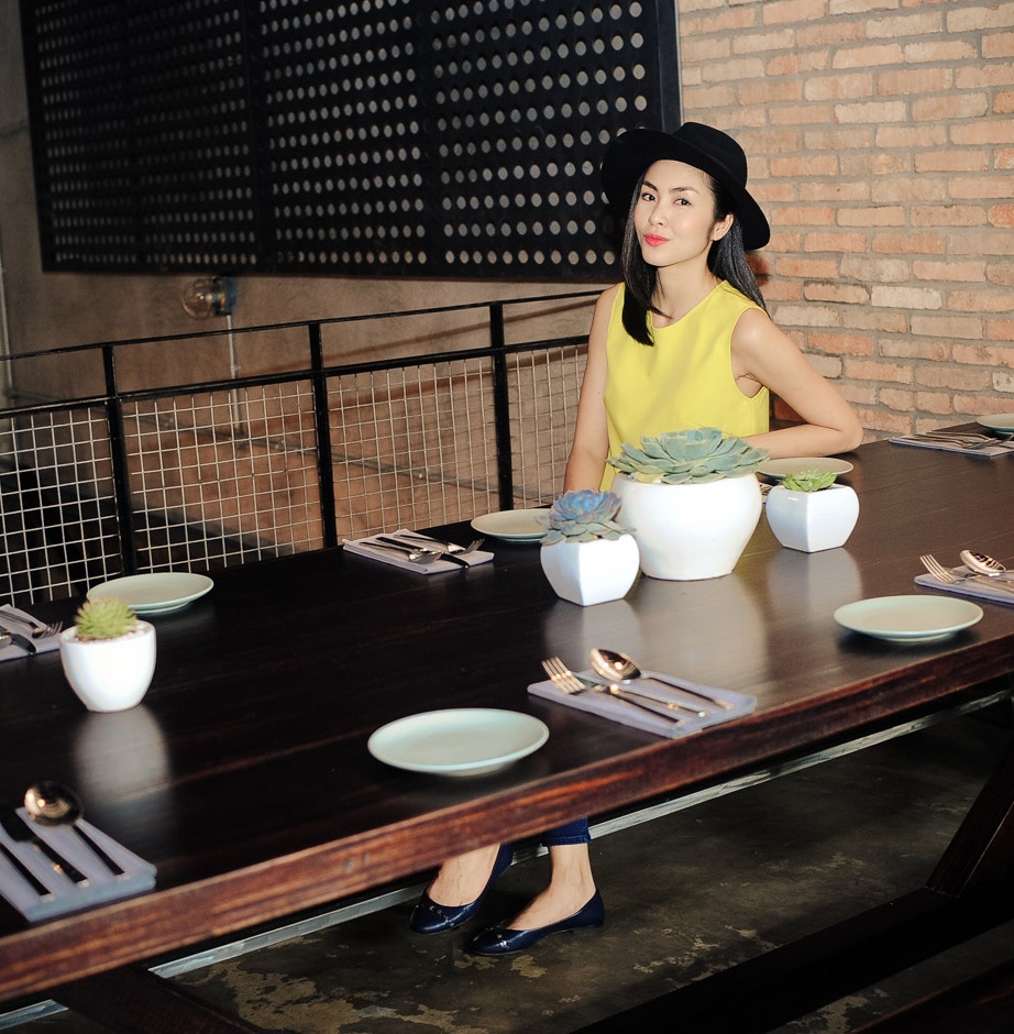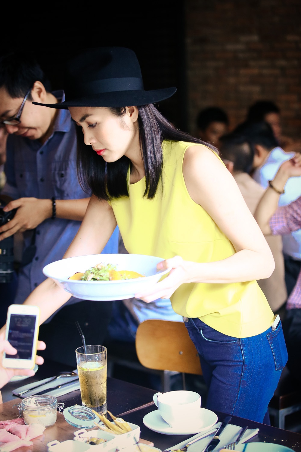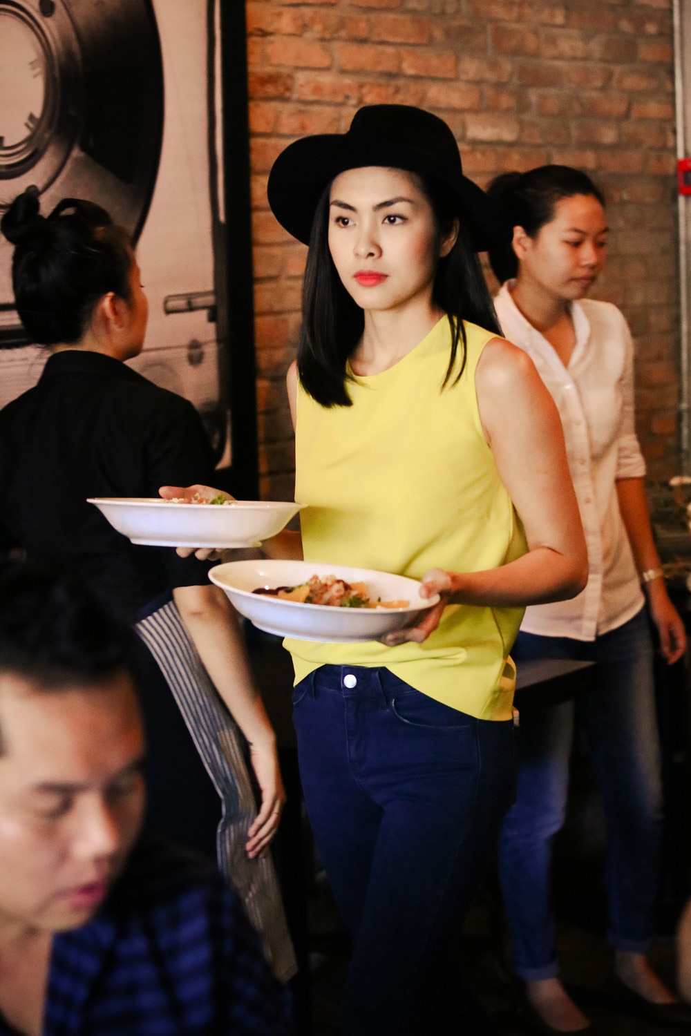 | Trong những ngày đầu khai trương, Tăng Thanh Hà thường xuyên có mặt tại nhà hàng để quản lý mọi việc. Hà Tăng rất hài lòng với thiết kế nội thất pha trộn giữa công nghiệp hiện đại và nét mộc mạc cho quán. |