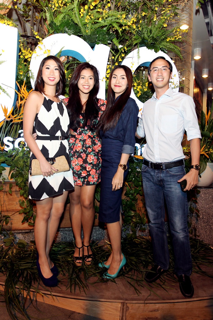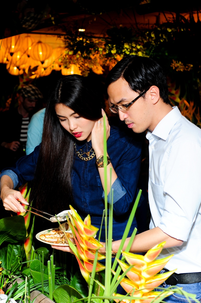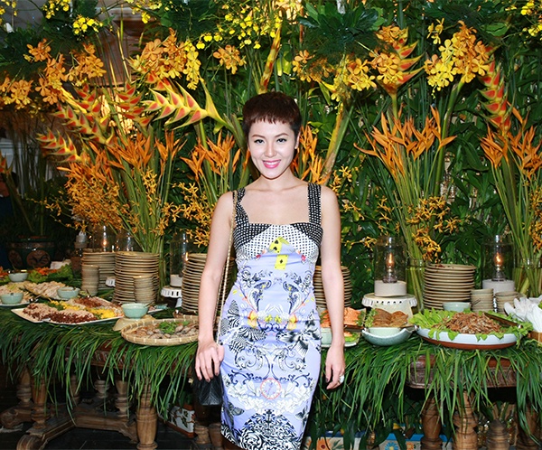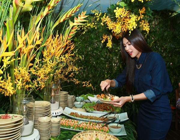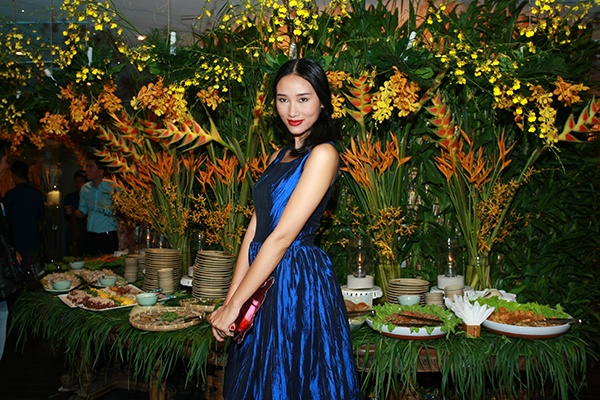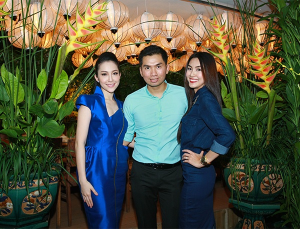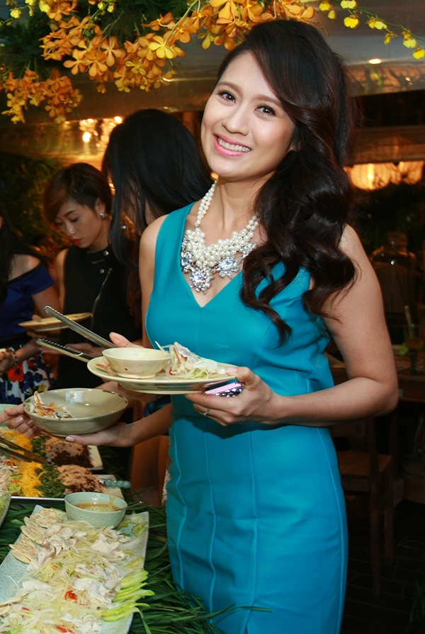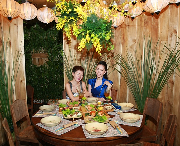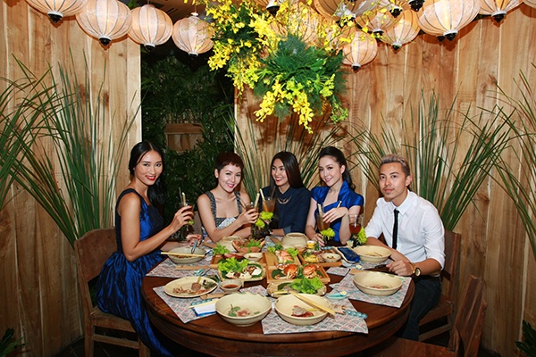 | Bà chủ quán mời các khách quý thưởng thức những món ăn đặc trưng của nhà hàng trong phòng VIP. Ngoài cùng bên trái và người mẫu Huyền Trang và ngoài cùng bên phải là nhiếp ảnh gia Bobby Nguyễn. |