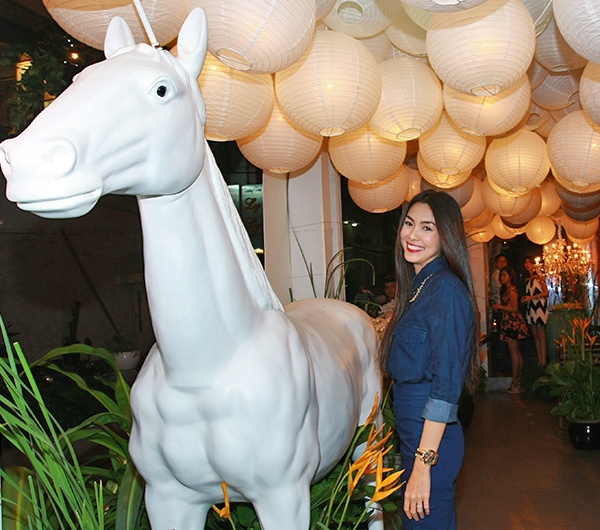 | Hà Tăng chụp ảnh cùng chú ngựa trắng là biểu tượng của nhà hàng. |