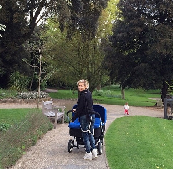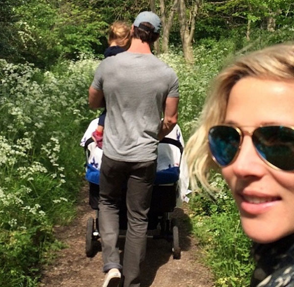 Người đẹp tỏ ra rất hãnh diện khi ông xã rất yêu chiều vợ con. Trong hình, "Thần Sấm Thor" vừa bế con gái lớn, vừa đẩy xe của hai con trai song sinh. Chris Hemsworth đang rất hạnh phúc về gia đình ấm áp của mình. Anh từng chia sẻ trên tạp chí Parade về việc làm cha: "Tôi nghĩ làm bố khiến người đàn ông chín chắn hơn. Điều đó rất tuyệt vời. Khi sinh con, ta sẽ ngồi bên chúng hàng giờ và nghĩ mình sẽ làm gì. Thật thú vị. Bất kỳ ở đâu và làm gì tôi cũng nghĩ về vợ và các con của mình".