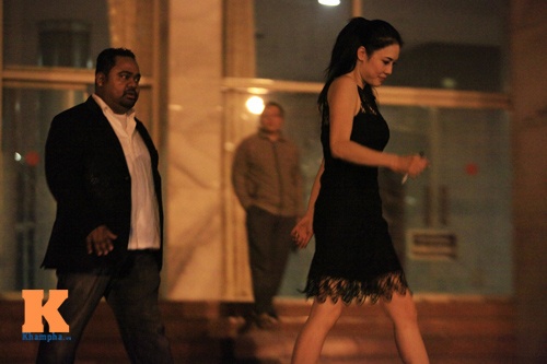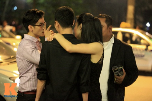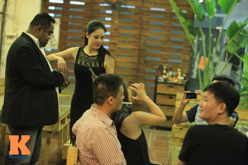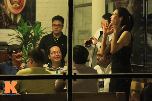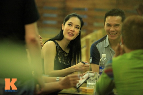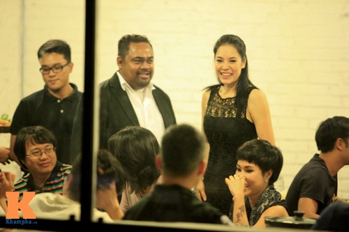 | Sau khi gặp gỡ bạn bè, hai vợ chồng tiếp tục di chuyển sang bàn phòng bên cạnh để cảm ơn mọi người trong ê-kíp chương trình trong đó có nữ ca sĩ Uyên Linh. |