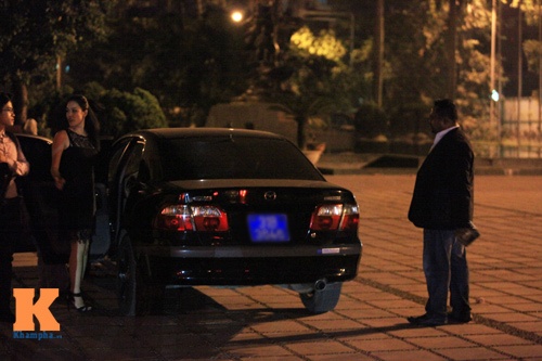 | Hai vợ chồng được một xe biển xanh đến đón. |
