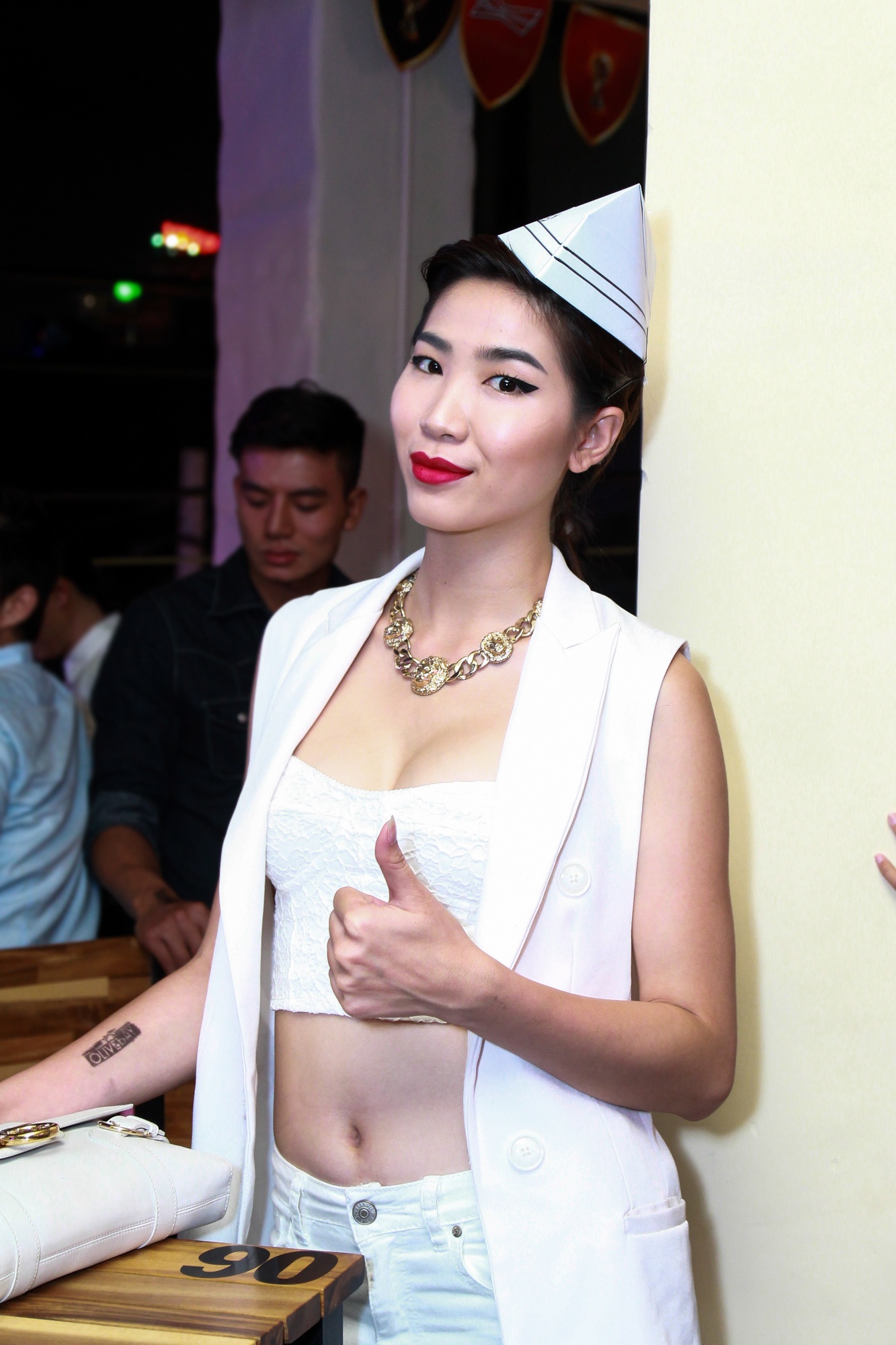 | Người mẫu Minh Trung đi cùng ông bầu và vũ công Mỹ An. |