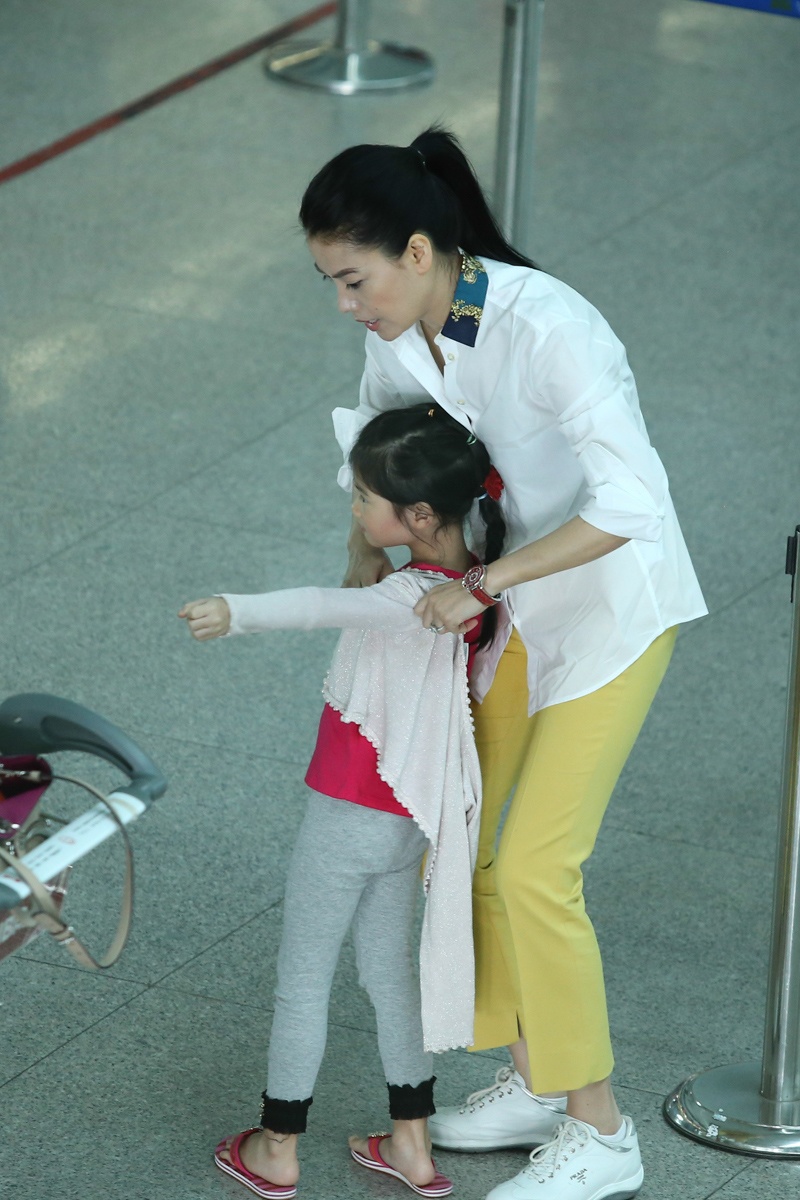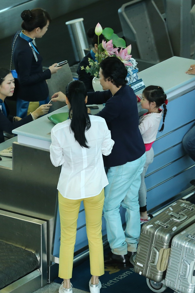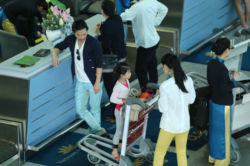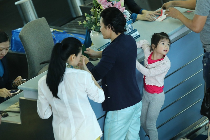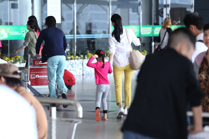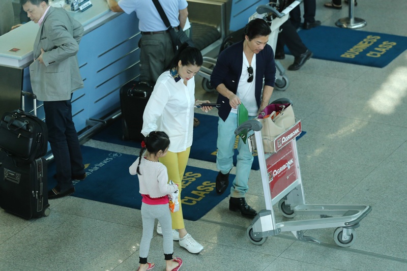 | Hai vợ chồng tất bận chuyền hành lý xuống xe. Trong khi Trần Bảo Sơn đẩy hành lý thì Trương Ngọc Ánh dắt con gái Bảo Tiên. Cả hai rất vội vàng đi vào khu vực soát vé để kịp giờ bay. |