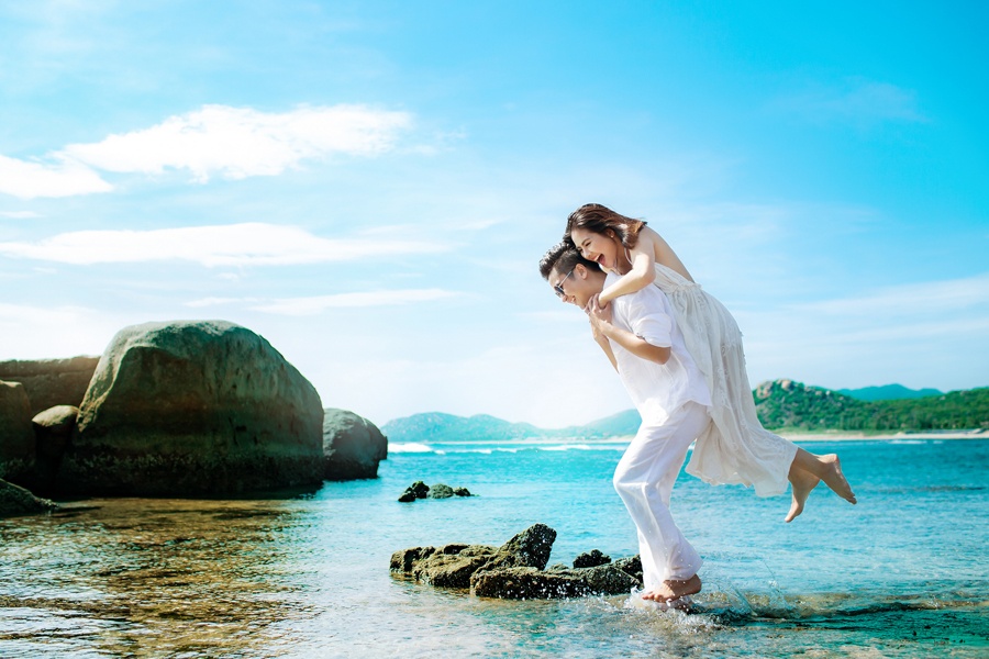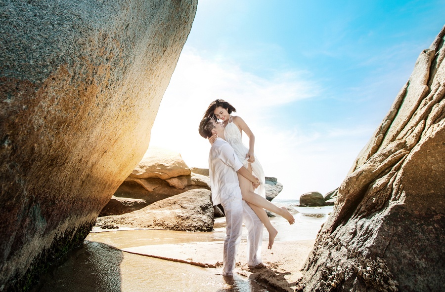 | Yêu thích cảnh biển mênh mông, thơ mộng nên Vân Trang - Hữu Quân đã đến Hang Rái (Ninh Thuận), địa điểm du lịch nổi tiếng để thực hiện bộ ảnh cưới lãng mạn. |