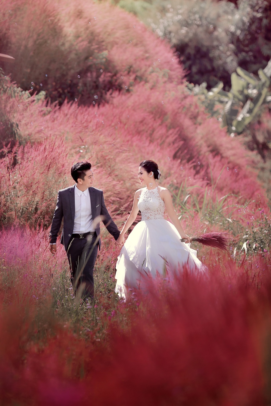 | Những hình ảnh kế tiếp được chụp giữa đồng cỏ lau. Chú rể, cô dâu trong trang phục sắc trắng cổ điển, nổi bật giữa thiên nhiên huyền bí. |