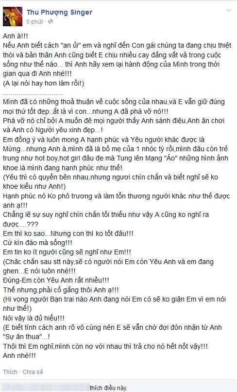 Trong dòng tâm sự của mình, danh hài muốn vợ cũ chuyên tâm vào cuộc sống của mỗi người và cùng nhau chăm lo cho con gái. Anh cũng nhắc nhở Thu Phượng, Facebook là một nơi riêng tư kiểu công cộng nên cô cần suy nghĩ thật kỹ trước khi nói, vì nó mang giá trị ảo nhưng sự tổn thương là thật.