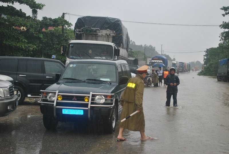 | Không chỉ gây ngập nghiêm trọng ở địa bàn dân cư, quốc lộ 1A đoạn qua huyện Tĩnh Gia cũng đang bị nước lũ tấn công. Cụ thể hơn 4 km đường bị ngập trên 1m khiến giao thông qua đây bị cô lập hoàn toàn. |