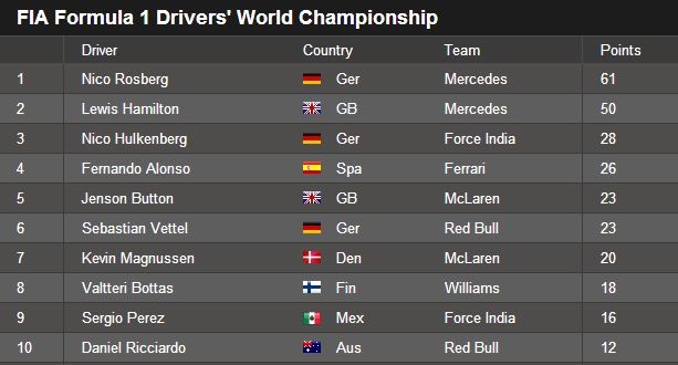 Ngoài sự thống trị của Mercedes với cú đúp chiến thắng thứ 2 liên tiếp, Bahrain GP còn chứng kiến những màn so tài rất hấp dẫn giữa những tay đua trong cùng một đội hay cú đâm của Pastor Maldonado khiến chiếc xe của Esteban Gutierrez lộn nhào trên không ở vòng 41.| Top 10 tay đua tại chặng Bahrain GP 2014. |