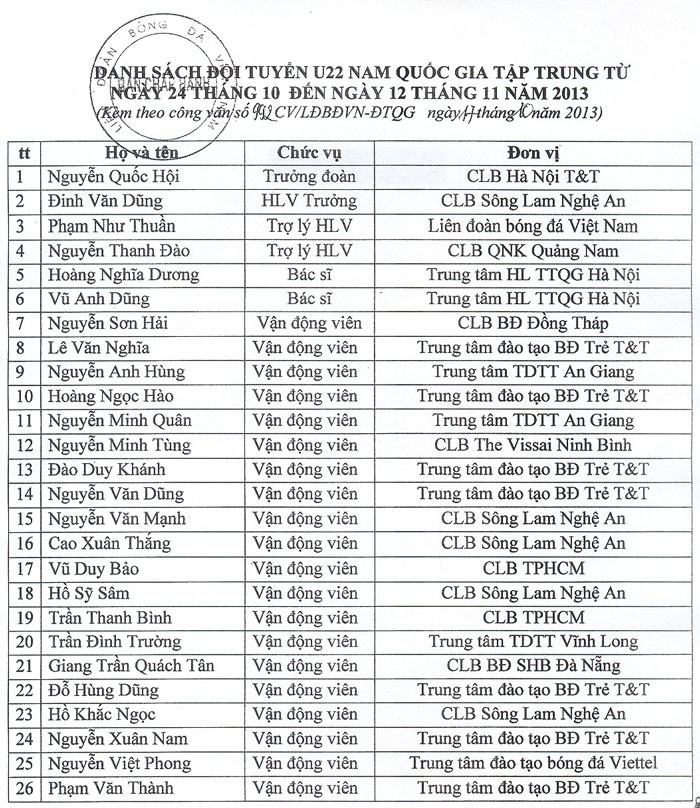 Danh sách triệu tập đã được LĐBĐVN trình Tổng cục TDTT phê duyệt, ĐT U22 QG quy tụ 20 cầu thủ, trong đó lực lượng nòng cốt là những gương mặt thi đấu xuất sắc trong màu áo ĐT U21 báo Thanh Niên Việt Nam tại giải bóng đá U21 Quốc tế - Cúp Báo Thanh Niên 2013. Ngoài ra, nhằm tăng cường sức cạnh tranh cho ĐT U22 QG, HLV Đinh Văn Dũng cũng bổ sung 4 gương mặt là Văn Nghĩa, Ngọc Hào, Xuân Nam và Văn Thành. HLV phó Phạm Như Thuần của U19 Việt Nam cũng sẽ tham gia công tác huấn luyện cùng ông Đinh Văn Dũng.