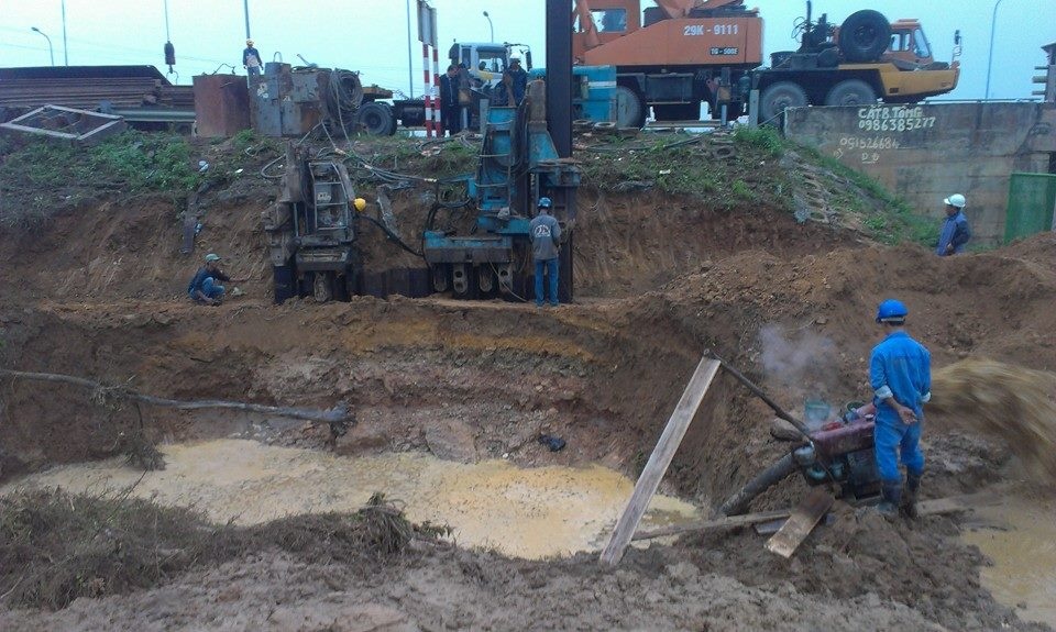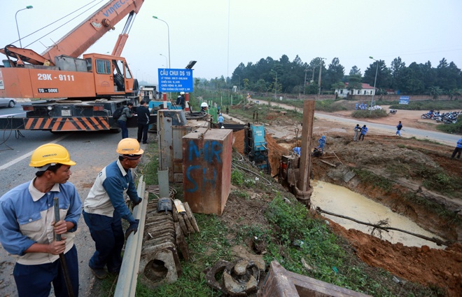 | Đơn vị khắc phục huy động người và 2 máy ép cừ, 2 cẩu và 3 máy đào làm việc liên tuc. |