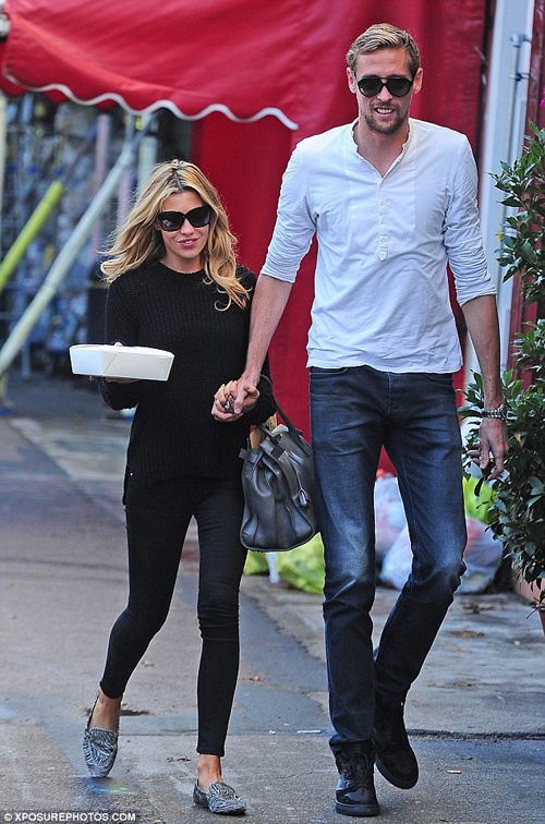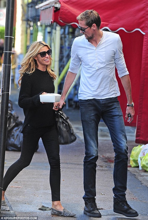 Ngôi sao bóng đá Peter Crouch nắm chặt tay vợ yêu, vừa đi vừa không ngớt cười nói.