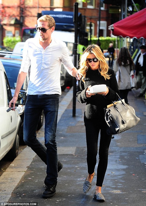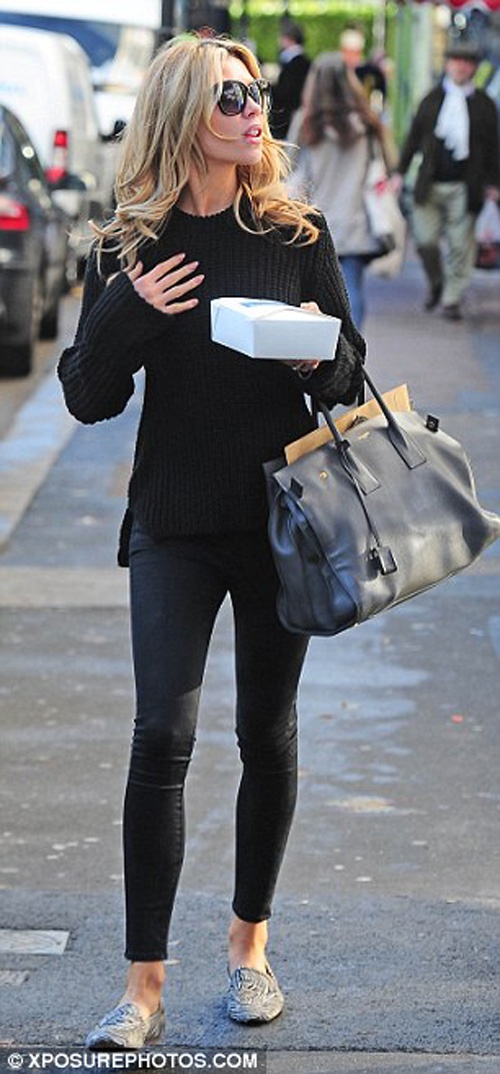 Xuống phố cùng chồng, siêu mẫu một con Abbey Clancy diện cả một cây màu đen khá đơn giản, gọn tiện. Áo len, quần bò, giày Zara họa tiết ngựa vằn, túi xách cỡ lớn, Abbey vừa năng động nhưng không kém phần gợi cảm.