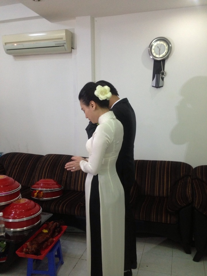 Cặp đôi thành kính chắp tay cúng gia tiên.