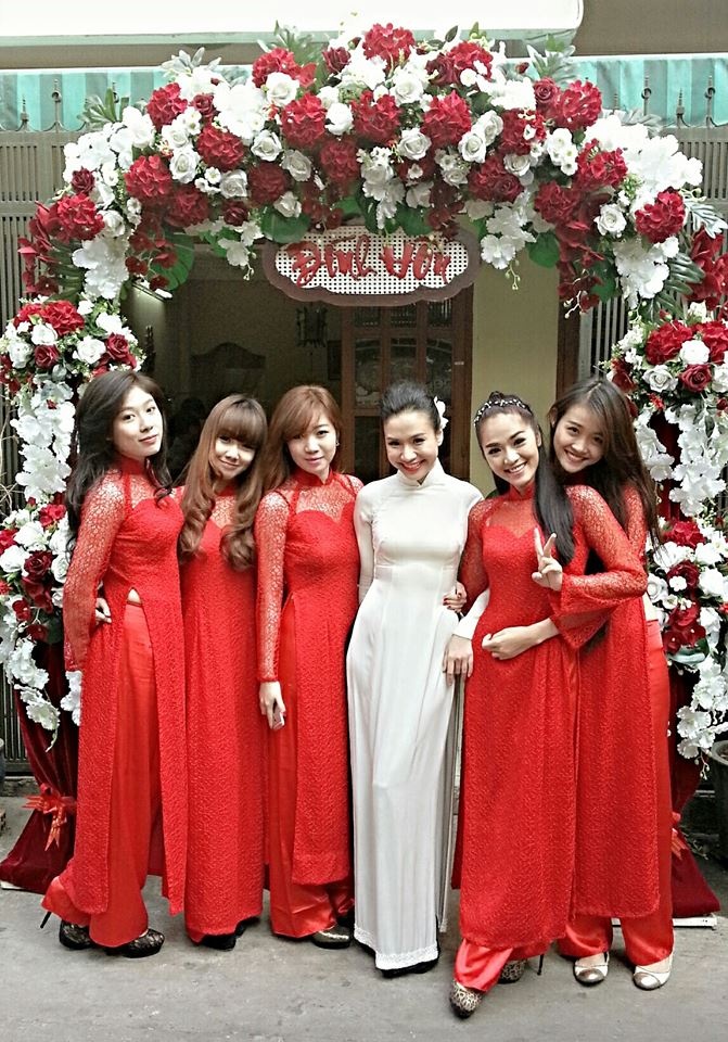 | Trên trang cá nhân của Quỳnh Trâm và Baggio, bạn bè chia sẻ rất nhiều hình ảnh mới được chụp sáng ngày 26/1. Trong lễ đính hôn, nữ nha sĩ sinh năm 1987 diện áo dài trắng khá đơn giản. Bộ áo dài từng được Quỳnh Trâm diện khi thực hiện những bộ hình cưới cách đây không lâu. 5 cô phụ dâu, giúp đỡ tráp lại mặc áo dài đỏ nổi bật. |