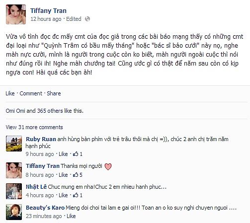 | Tối 25/1, ngay sau khi xuất hiện thông tin Baggio sắp cưới vợ, không ít người cho rằng cặp đôi đã "ăn cơm trước kẻng", "bác sĩ bảo cưới"... Điều này khiến Quỳnh Trâm khá bức xúc. Cô chia sẻ trên trang cá nhân: "Vừa vô tình đọc được mấy comment của độc giả trong các bài báo mạng thấy có những lời đại loại như "Quỳnh Trâm có bầu mấy tháng" hoặc "bác sĩ bảo cưới" này nọ, nghe mà nực cười. Mình là người trong cuộc còn không biết, mà người ngoài cuộc thì nói như đúng rồi! Nghe màchướng tai! Cũng ước gì có thật để năm sau còn có kịp ngựa con! Hài quá các bạn ạ". |