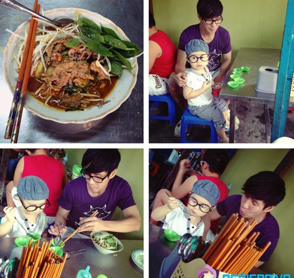 | Hai bố con Lý Hải đang thưởng thức món hủ tiếu sa tế |